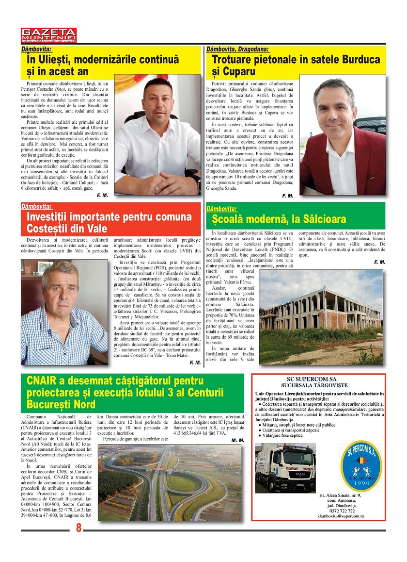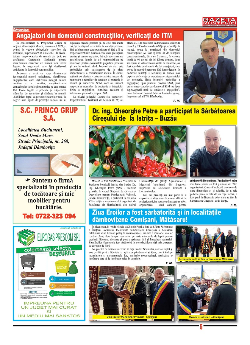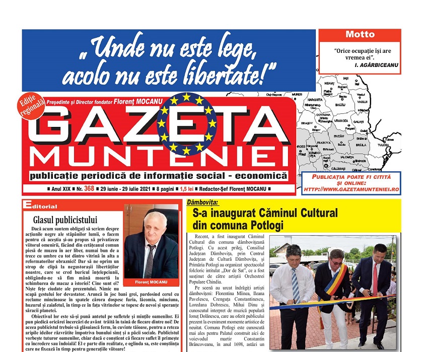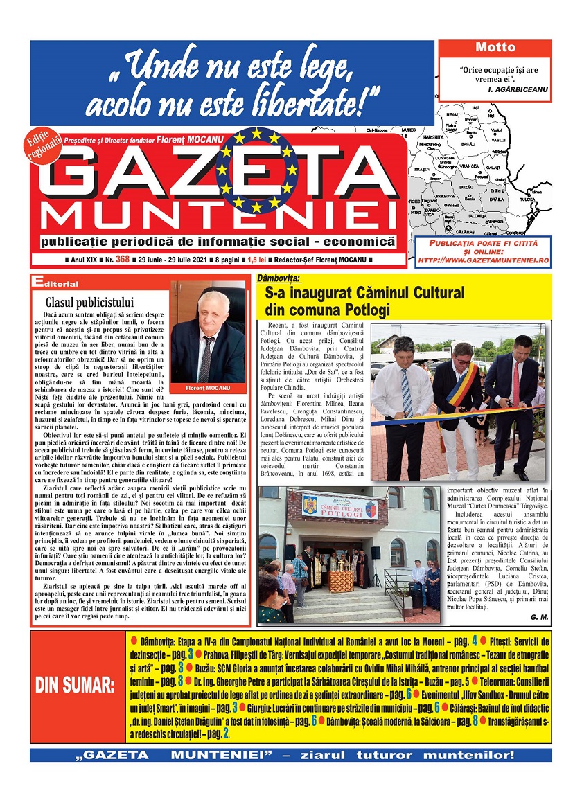 A ieşit de sub tipar nr. 368 al publicaţiei regionale “Gazeta Munteniei”, periodic de informaţie social economică. Din cuprinsul acestei ediţii spicuim: Editorialul intitulat: Glasul publicistului semnat de directorul Florenţ Mocanu, precum şi articole referitoare la: Dâmboviţa: Etapa a IV-a din Campionatul Naţional Individual al Romȃniei a avut loc la Moreni, Pitești: Servicii de dezinsecție, Prahova, Filipeștii de Târg: Vernisajul expoziției temporare „Costumul tradițional românesc – Tezaur de etnografie și artă”, Buzău: SCM Gloria a anunțat încetarea colaborării cu Ovidiu Mihai Mihăilă, antrenor principal al secției handbal feminin, Dr. ing. Gheorghe Petre a participat la Sărbătoarea Cireșului de la Istrița – Buzău, Teleorman: Consilierii județeni au aprobat proiectul de lege aflat pe ordinea de zi a ședinței extraordinare, Evenimentul „Ilfov Sandbox – Drumul către un județ Smart”, în imagini, Giurgiu: Lucrări în continuare pe străzile din municipiu, Călăraşi: Bazinul de înot didactic „dr. ing. Daniel Ştefan Drăgulin” a fost dat în folosinţă, Dâmbovița: Școală modernă, la Sălcioara, Transfăgărășanul s-a redeschis circulației!.