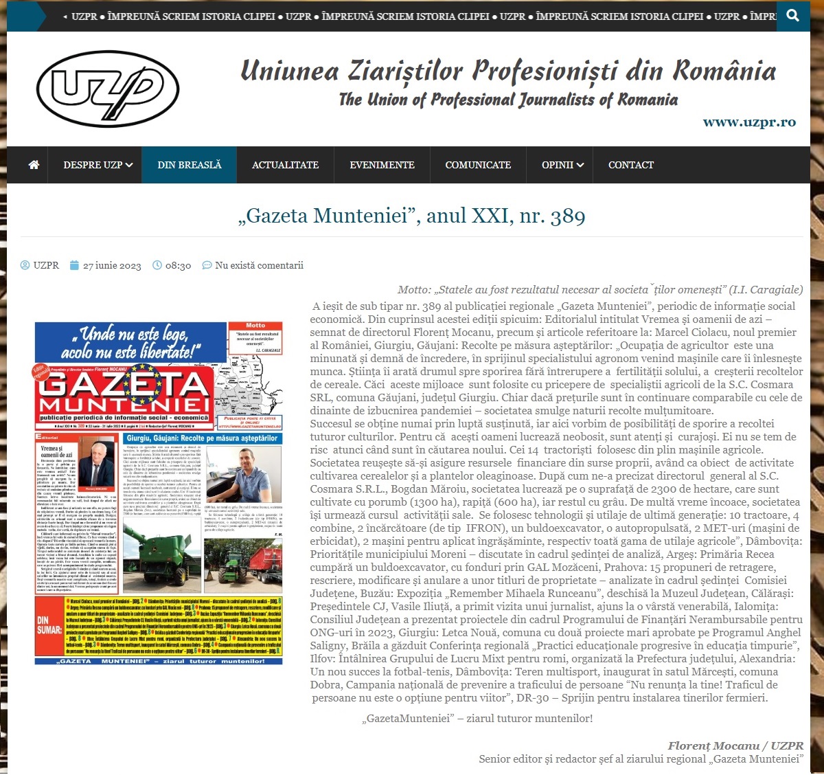 A ieşit de sub tipar nr. 389 al publicaţiei regionale „Gazeta Munteniei”, periodic de informaţie social economică. Din cuprinsul acestei ediţii spicuim: Editorialul intitulat Vremea și oamenii de azi – semnat de directorul Florenţ Mocanu, precum şi articole referitoare la: Marcel Ciolacu, noul premier al României, Giurgiu, Găujani: Recolte pe măsura aşteptărilor: „Ocupaţia de agricultor este una minunată și demnă de încredere, în sprijinul specialistului agronom venind mașinile care îi înlesneşte munca. Ştiinţa îi arată drumul spre sporirea fără întrerupere a fertilităţii solului, a creșterii recoltelor de cereale. Căci aceste mijloace sunt folosite cu pricepere de specialiştii agricoli de la S.C. Cosmara SRL, comuna Găujani, judeţul Giurgiu. Chiar dacă prețurile sunt în continuare comparabile cu cele de dinainte de izbucnirea pandemiei – societatea smulge naturii recolte mulţumitoare. Succesul se obține numai prin luptă susținută, iar aici vorbim de posibilități de sporire a recoltei tuturor culturilor. Pentru că acești oameni lucrează neobosit, sunt atenţi și curajoși. Ei nu se tem de risc atunci când sunt în căutarea noului. Cei 14 tractoriști folosesc din plin mașinile agricole. Societatea reușește să-și asigure resursele financiare din surse proprii, având ca obiect de activitate cultivarea cerealelor şi a plantelor oleaginoase. După cum ne-a precizat directorul general al S.C. Cosmara S.R.L., Bogdan Măroiu, societatea lucrează pe o suprafață de 2300 de hectare, care sunt cultivate cu porumb (1300 ha), rapiță (600 ha), iar restul cu grâu. De multă vreme încoace, societatea își urmează cursul activităţii sale. Se folosesc tehnologii şi utilaje de ultimă generaţie: 10 tractoare, 4 combine, 2 încărcătoare (de tip IFRON), un buldoexcavator, o autopropulsată, 2 MET-uri (mașini de erbicidat), 2 maşini pentru aplicat îngrăşăminte, respectiv toată gama de utilaje agricole”, Dâmbovița: Prioritățile municipiului Moreni – discutate în cadrul ședinței de analiză, Argeș: Primăria Recea cumpără un buldoexcavator, cu fonduri prin GAL Mozăceni, Prahova: 15 propuneri de retragere, rescriere, modificare și anulare a unor titluri de proprietate – analizate în cadrul ședinței Comisiei Judeţene, Buzău: Expoziția „Remember Mihaela Runceanu”, deschisă la Muzeul Județean, Călăraşi: Preşedintele CJ, Vasile Iliuţă, a primit vizita unui jurnalist, ajuns la o vârstă venerabilă, Ialomița: Consiliul Județean a prezentat proiectele din cadrul Programului de Finanțări Nerambursabile pentru ONG-uri în 2023, Giurgiu: Letca Nouă, comuna cu două proiecte mari aprobate pe Programul Anghel Saligny, Brăila a găzduit Conferința regională „Practici educaționale progresive în educația timpurie”, Ilfov: Întâlnirea Grupului de Lucru Mixt pentru romi, organizată la Prefectura judeţului, Alexandria: Un nou succes la fotbal-tenis, Dâmbovița: Teren multisport, inaugurat în satul Mărcești, comuna Dobra, Campania națională de prevenire a traficului de persoane “Nu renunța la tine! Traficul de persoane nu este o opțiune pentru viitor”, DR-30 – Sprijin pentru instalarea tinerilor fermieri.