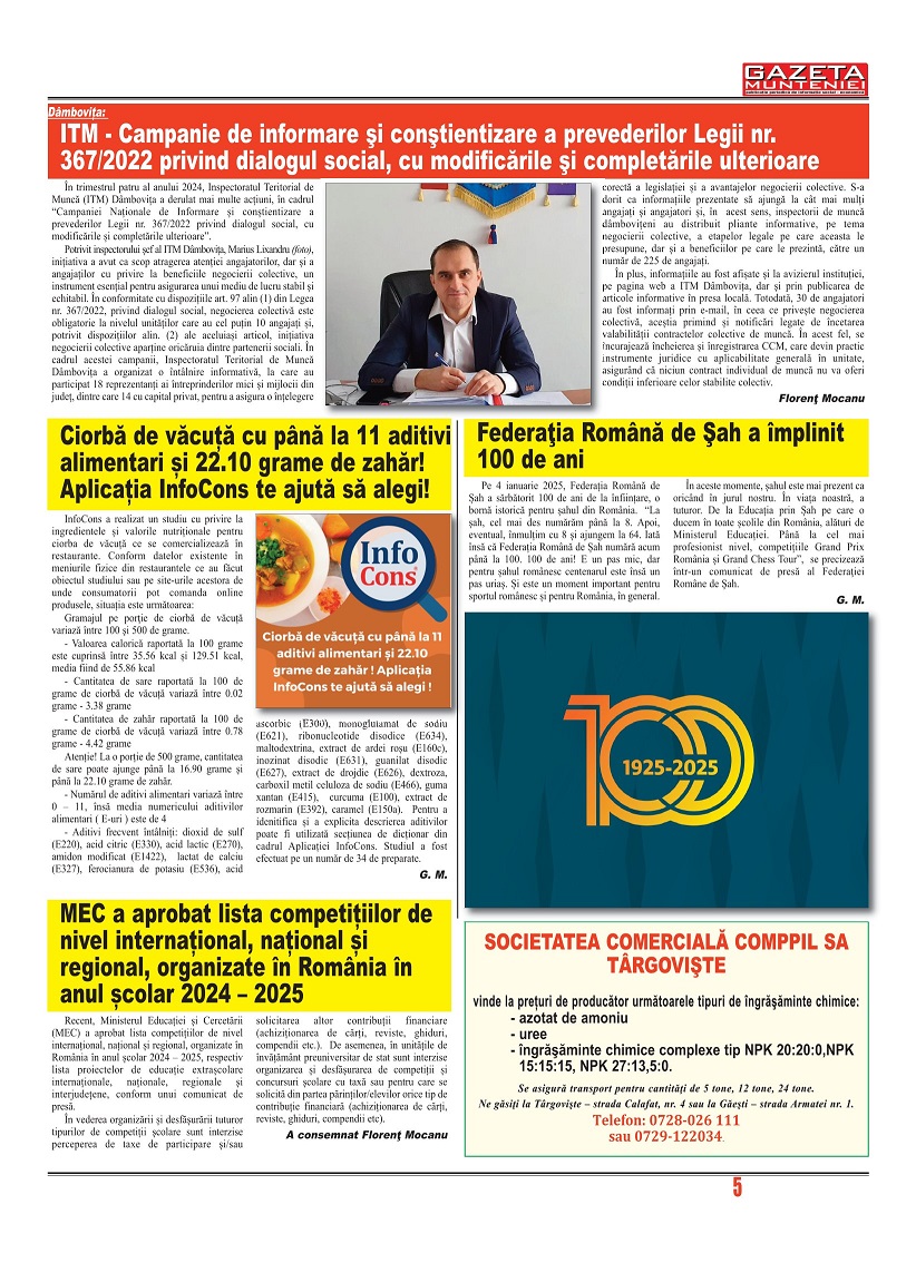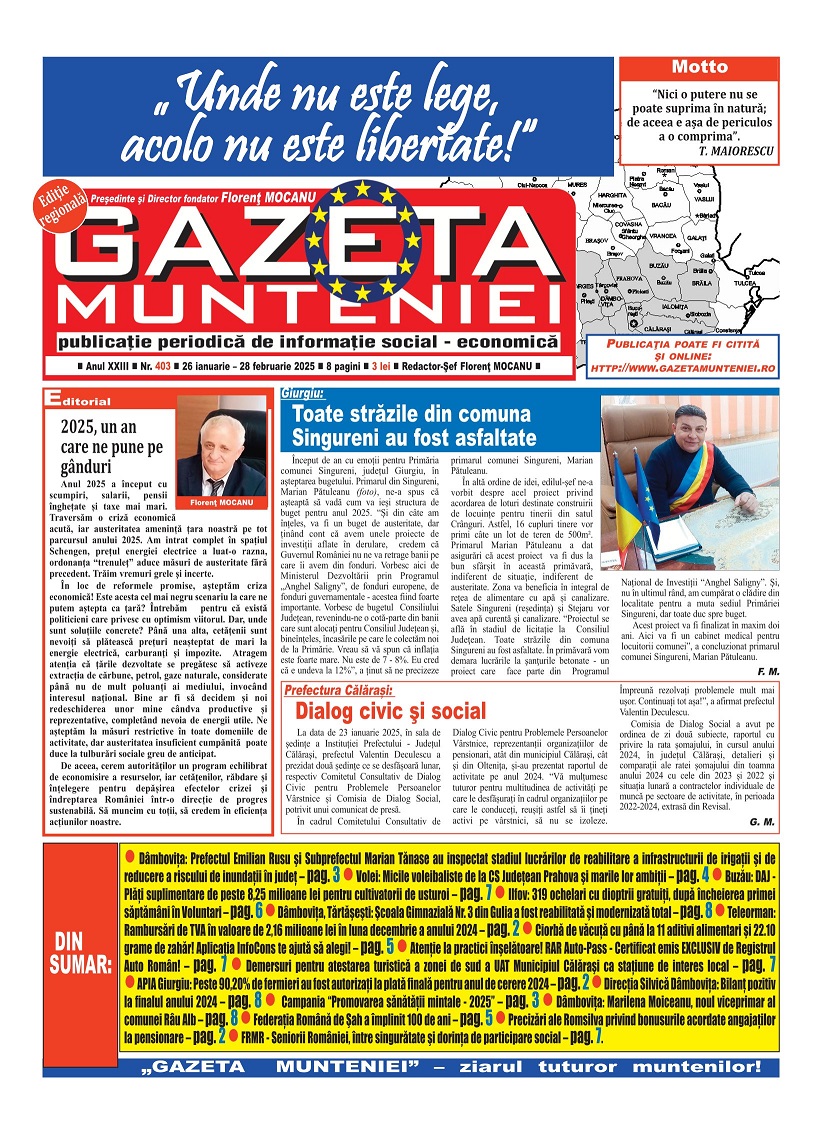 A ieşit de sub tipar nr. 403 al publicaţiei regionale “Gazeta Munteniei”, periodic de informaţie social economică. Din cuprinsul acestei ediţii spicuim: Editorialul intitulat: 2025, un an care ne pune pe gânduri – semnat de directorul Florenţ Mocanu, precum şi articole referitoare la: Dâmbovița: Prefectul Emilian Rusu și Subprefectul Marian Tănase au inspectat stadiul lucrărilor de reabilitare a infrastructurii de irigații și de reducere a riscului de inundații în județ, Volei: Micile voleibaliste de la CS Judeţean Prahova şi marile lor ambiţii, Buzău: DAJ – Plăți suplimentare de peste 8,25 milioane lei pentru cultivatorii de usturoi, Ilfov: 319 ochelari cu dioptrii gratuiți, după încheierea primei săptămâni în Voluntari, Dâmbovița, Tărtășești: Şcoala Gimnazială Nr. 3 din Gulia a fost reabilitată și modernizată total, Teleorman: Rambursări de TVA în valoare de 2,16 milioane lei în luna decembrie a anului 2024, Ciorbă de văcuță cu până la 11 aditivi alimentari și 22.10 grame de zahăr! Aplicația InfoCons te ajută să alegi!, Atenție la practici înșelătoare! RAR Auto-Pass – Certificat emis EXCLUSIV de Registrul Auto Român!, Demersuri pentru atestarea turistică a zonei de sud a UAT Municipiul Călărași ca stațiune de interes local, APIA Giurgiu: Peste 90,20% de fermieri au fost autorizați la plată finală pentru anul de cerere 2024, Direcția Silvică Dâmbovița: Bilanț pozitiv la finalul anului 2024, Campania “Promovarea sănătății mintale – 2025”, Dâmboviţa: Marilena Moiceanu, noul viceprimar al comunei Râu Alb, Federaţia Română de Şah a ȋmplinit 100 de ani, Precizări ale Romsilva privind bonusurile acordate angajaţilor la pensionare, FRMR – Seniorii României, între singurătate și dorința de participare socială.