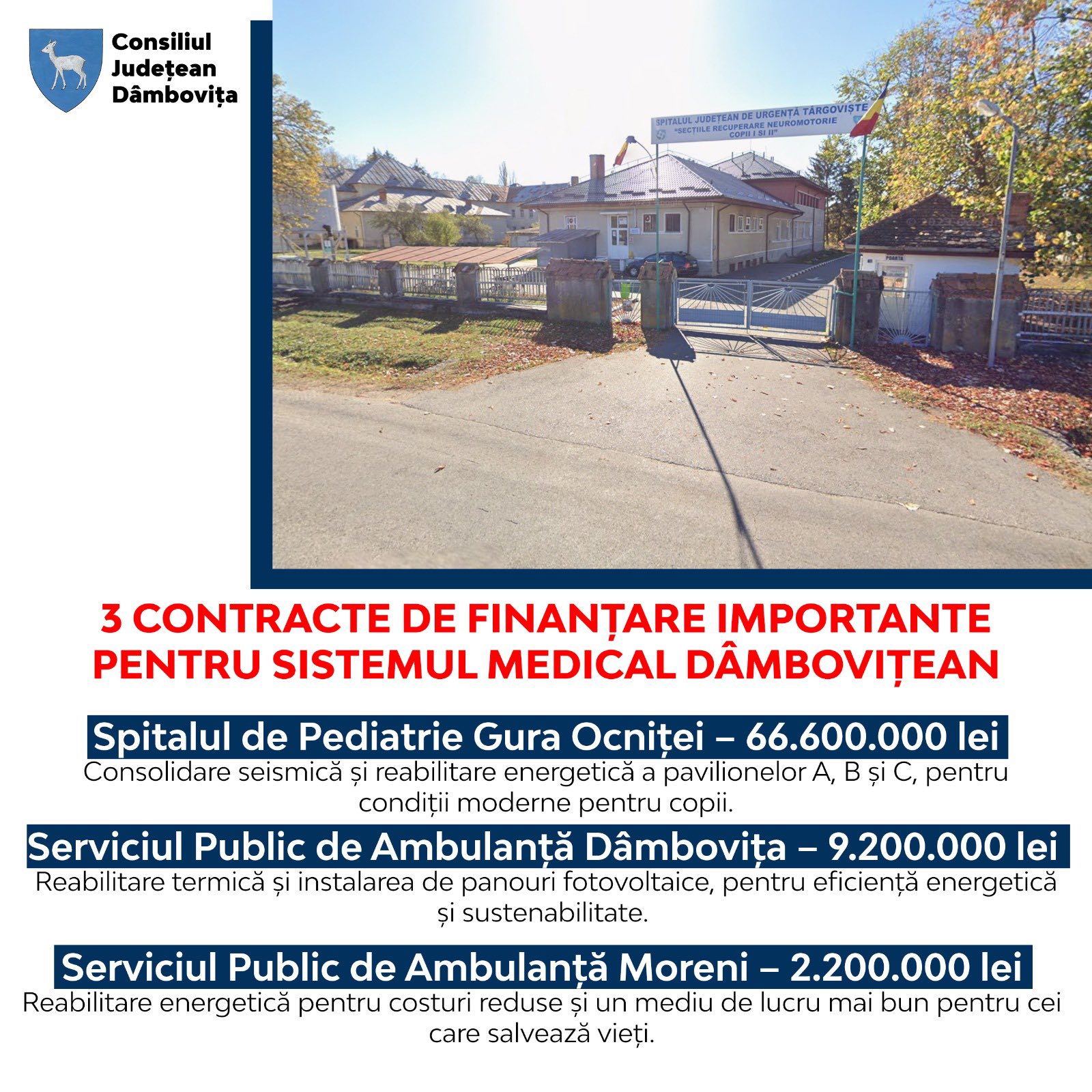 ►Spitalul de Pediatrie Gura Ocniței (66,6 mil. lei): Pavilioanele A, B și C vor fi consolidate seismic și reabilitate energetic, oferind copiilor condiții de tratament la standarde moderne.