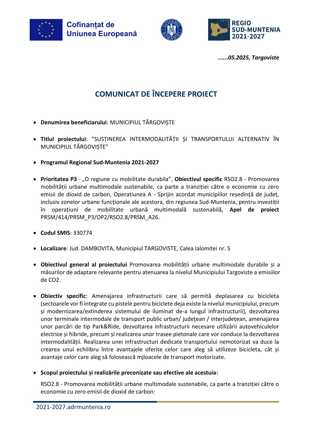 COMUNICAT DE INCEPERE PROIECT ”SUSTINEREA INTERMODALITATII SI TRANSPORTULUI ALTERNATIV IN MUNICIPIUL TARGOVISTE”