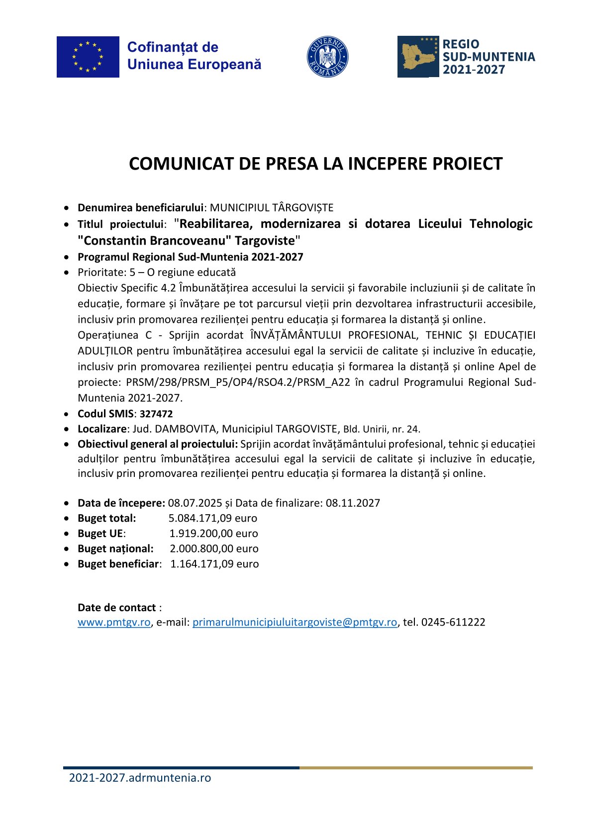 Date de contact : www.pmtgv.ro, e-mail: primarulmunicipiuluitargoviste@pmtgv.ro, tel. 0245-611222