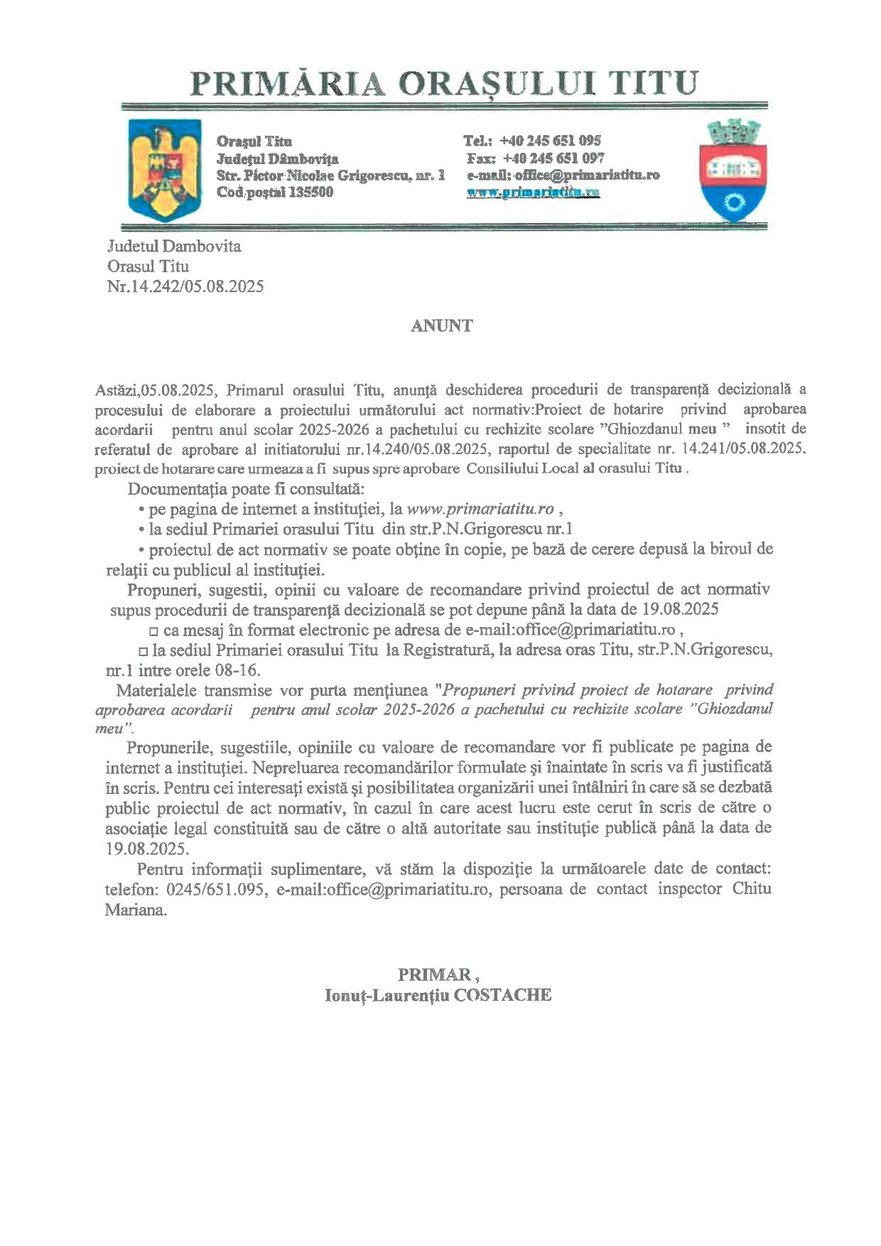 la adresa de mail: office@primariatitu.ro