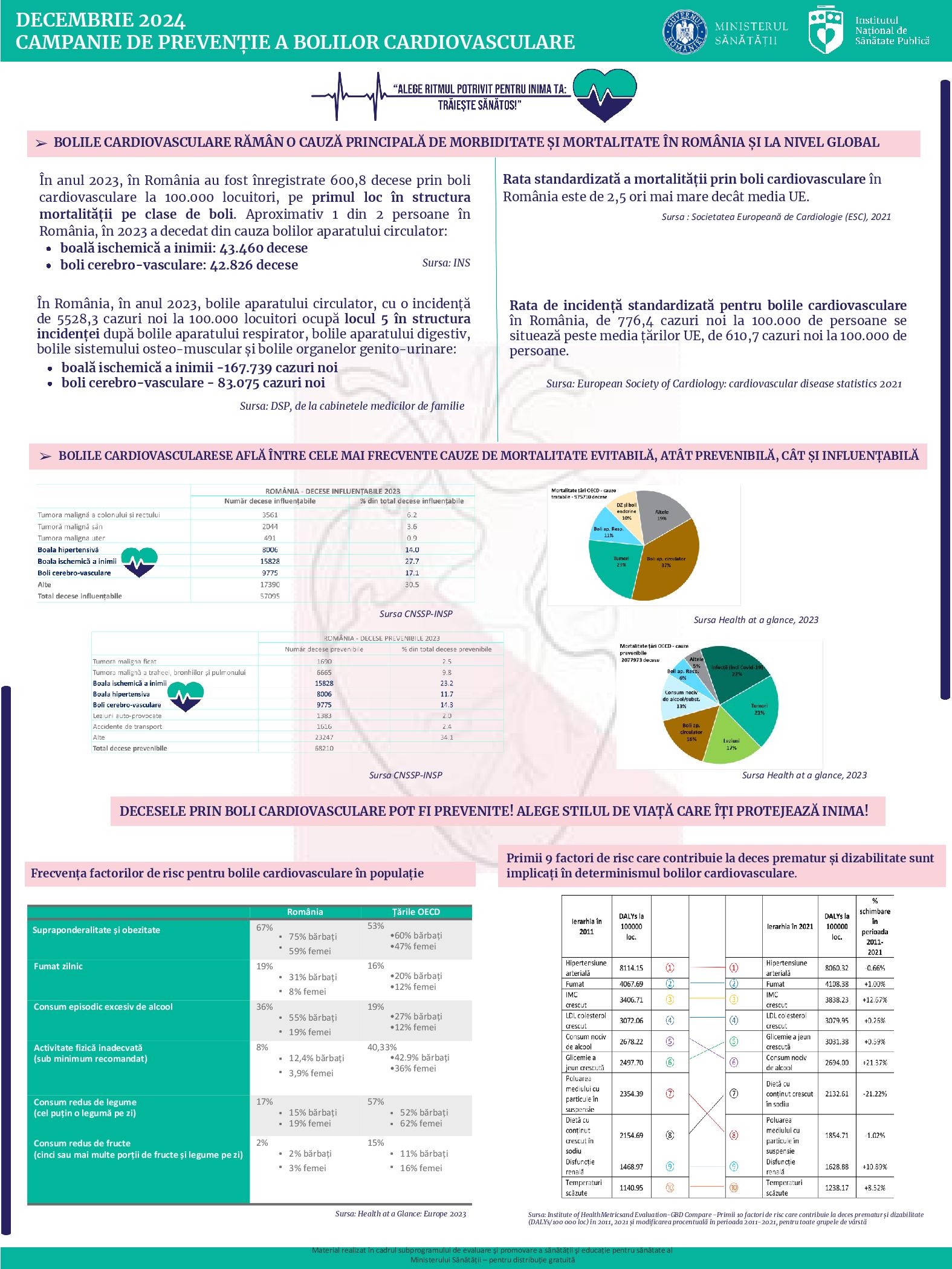 În luna decembrie 2024 Institutul Național de Sănătate Publică și Direcțiile Județene de Sănătate Publică și a Municipiului București derulează campania de informare, educare și conștientizare cu privire la factorii de risc pentru bolile cardiovasculare, finanțată de Ministerul Sănătății.