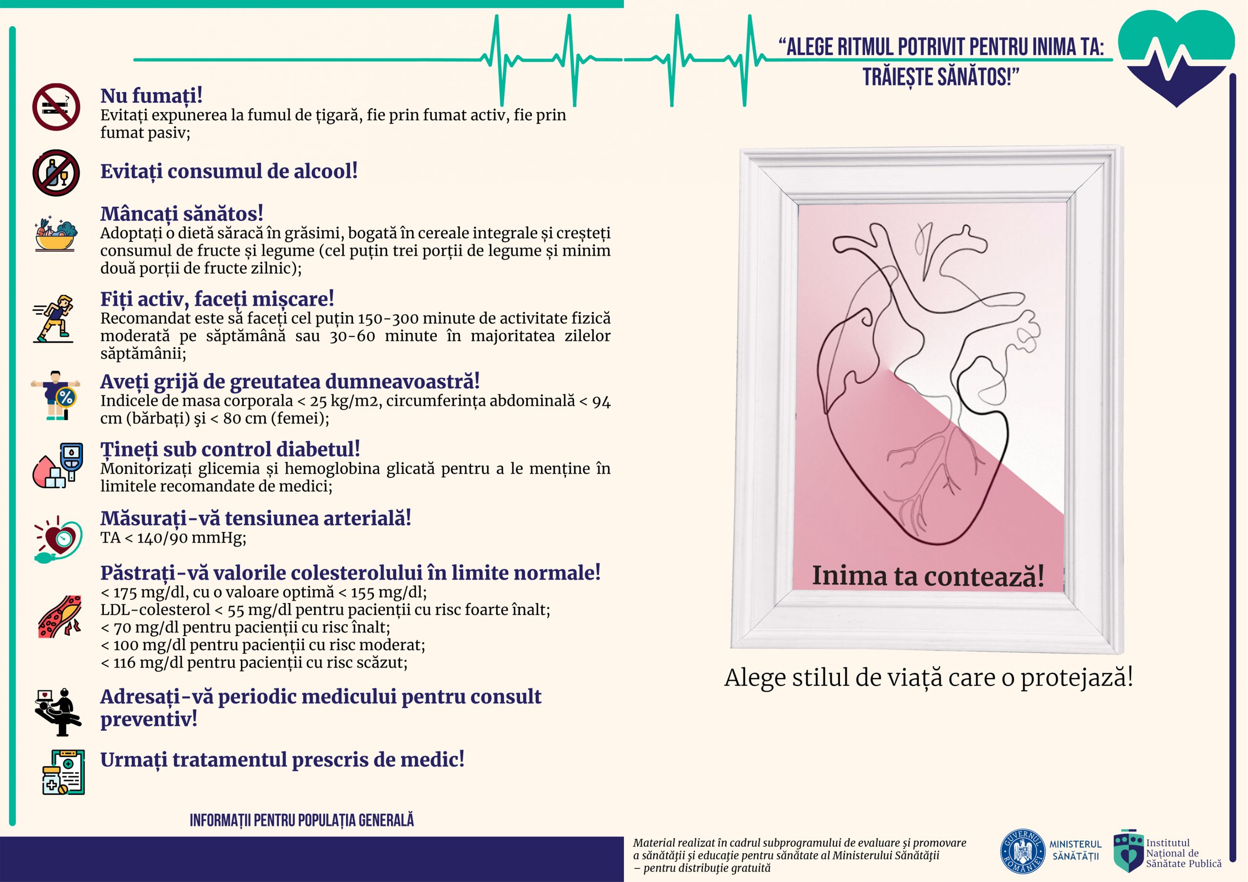 Cu ocazia acestei campanii, Institutul Național de Sănătate Publică reiterează faptul că renunțarea la fumat, reducerea cantității de sare, consumul de fructe și legume în cantitate optimă, activitatea fizică regulată și evitarea consumului excesiv de alcool, reduc semnificativ riscul apariției bolilor cardiovasculare. De asemenea, identificarea persoanelor cu risc crescut cardiovascular permite instituirea unui tratament adecvat precoce. Creșterea nivelului de informare și conștientizare al pacienților cu factori de risc metabolici (ex:hiperglicemie, dislipidemii, HTA,etc) cu privire la importanța parametrilor care reflectă factorii de risc cardiovascular și importanța respectării recomandărilor și tratamentului prescris de medic, poate salva un număr important de vieți. Promovarea adoptării unui stil de viață sănătos, de timpuriu, la preșcolari și școlari este la fel de importantă, comportamentele sanogene formându-se devreme în copilărie.