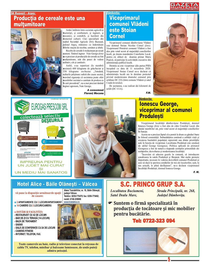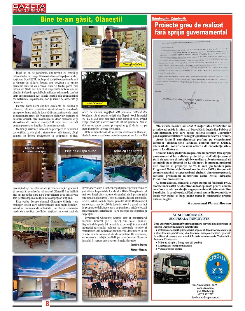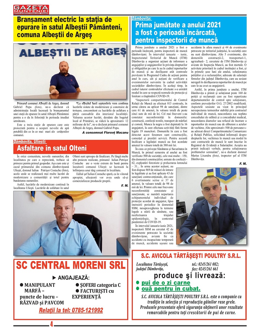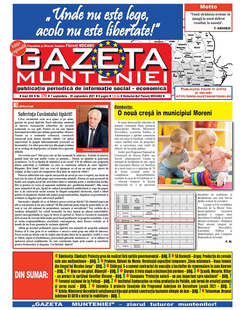 A ieşit de sub tipar nr. 370 al publicaţiei regionale “Gazeta Munteniei”, periodic de informaţie social economică. Din cuprinsul acestei ediţii spicuim: Editorialul intitulat: Suferinţa Cuvântului tipărit! semnat de directorul Florenţ Mocanu, precum şi articole referitoare la: Dâmboviţa, Cândeşti: Proiecte greu de realizat fără sprijin guvernamental, SA Buzoești – Argeș: Producţia de cereale este una mulţumitoare, Prahova, Vălenii de Munte: Vernisajul expoziției temporare „Eleva misionară – Noua femeie din timpul lui Nicolae Iorgaˮ, Călăraşi: S-a semnat contractul de execuţie a lucrărilor de reamenajare în zona Navrom, Bine te-am găsit, Olănești!, Giurgiu: A treia etapă a dezinsecției aeriene, Școală, Meserie, Viitor – un proiect în sprijinul tinerilor ilfoveni, Campania “Protecția solară – un pas important spre sănătate!”, Forumul național de la Potlogi, Institutul Cantacuzino va relua producția de Polidin, sub formă de ursuleți gumați și spray nazal, Ialomița: 5 proiecte finanțate din Programul Județean de Dezvoltare Locală 2021, Brăila: Ministerul Dezvoltării soluționează blocajul privind construcția bazinului olimpic de înot, Teleorman: Drumul județean DJ 601B a intrat în reabilitare.