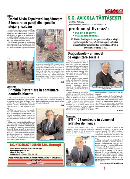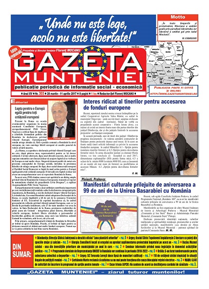 A ieşit de sub tipar nr. 303 al publicaţiei regionale “Gazeta Munteniei”, periodic de informaţie social economică. Din cuprinsul acestei ediţii spicuim: Editorialul intitulat: Lupta pentru o Europă egală pentru toți cetățenii europeni – semnat de directorul Florenţ Mocanu, precum şi articole referitoare la: Dâmboviţa: Direcţia Silvică Judeţeană a deschis oficial “Luna plantării arborilor”, Argeș: Ocolul Silvic Topoloveni împădureşte 3 hectare cu puieţi din speciile stejar şi salcâm, Giurgiu: Consilierii locali ai orașului au aprobat suplimentarea proiectului bugetului pe acest an, Buzău: Muzeul calului – una din investiţiile prioritare ale municipiului pe anul în curs, Seminar informativ privind noua legislație în domeniul achizițiilor publice, Programele derulate de Reprezentanţa UNICEF în România vor continua în perioada 2018-2022, Brăila: S-au furat tomberoanele pentru colectarea selectivă a deşeurilor, Argeș: SC Teracota Lerești duce lipsă de muncitori calificaţi, 110 de cetățeni străini depistați în situații ilegale de polițiștii români, Şerbănoiu Marin reclamă că unitatea sa nu mai poate funcționa din cauza blocajului reţelei electrice, MADR: 6.047 de solicitări de înscriere în programul de sprijin pentru tomate, Cezar Irimia (APCR): Nu suntem de acord cu desființarea cardului de sănătate.