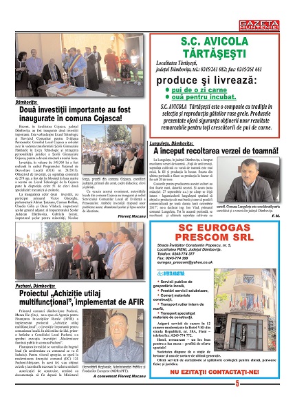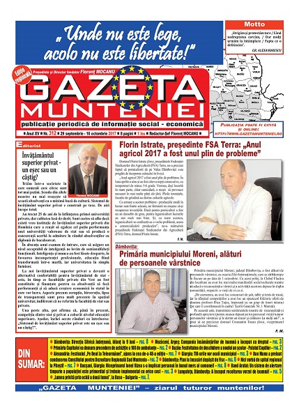 A ieşit de sub tipar nr. 312 al publicaţiei regionale “Gazeta Munteniei”, periodic de informaţie social economică. Din cuprinsul acestei ediţii spicuim: Editorialul intitulat: Învăţământul superior privat – un eșec sau un câştig? – semnat de directorul Florenţ Mocanu, precum şi articole referitoare la: Dâmboviţa: Direcţia Silvică Judeţeană, bilanț la 9 luni, Mozăceni, Argeș: Campania însămânţărilor de toamnă a început cu dreptul, Primăria Capitalei va demara procedura de achiziție a 100 de ambulanțe, Buzău: Festivitatea de deschidere a noului an școlar – Palatul Copiilor, Alexandria: Festivalul “Pe Deal la Teleormănel”, ajuns la cea de-a 48-a ediție, Giurgiu: TIR-urile vor ocoli municipiul, Dan Manu a preluat conducerea Consiliului pentru Dezvoltare Regională Sud Muntenia, Dâmboviţa: Plan la încasări depăşit de Fisc, Nici vorbă de spital regional la Piteşti!, Bucșani, Giurgiu: Viceprimarul Ionel Rizea s-a implicat personal în bunul mers al comunei!, Raed Arafat: Un sistem de alertare timpurie a populației este primordial și trebuie implementat cu orice cost, Lunguleţu, Dâmboviţa: A început recoltarea verzei de toamnă!, „Lumea privită prin ochii a două femei”, la Ruse – Bulgaria.