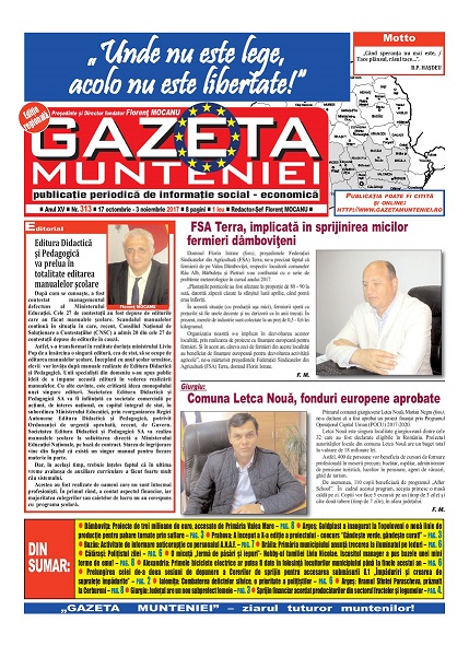 A ieşit de sub tipar nr. 313 al publicaţiei regionale “Gazeta Munteniei”, periodic de informaţie social economică. Din cuprinsul acestei ediţii spicuim: Editorialul intitulat: Editura Didactică şi Pedagogică va prelua în totalitate editarea manualelor şcolare – semnat de directorul Florenţ Mocanu, precum şi articole referitoare la: Dâmboviţa: Proiecte de trei milioane de euro, accesate de Primăria Valea Mare, Argeş: Goldplast a inaugurat la Topoloveni o nouă linie de producţie pentru pahare turnate prin suflare, Prahova: A început a X-a ediție a proiectului – concurs “Gândeşte verde, gândeşte curat!”, Buzău: Activitate de informare anticorupție cu personalul A.N.A.F., Brăila: Primăria municipiului anunţă trecerea la iluminatul pe leduri, Călăraşi: Polițistul zilei, O micuţă „fermă de păsări și iepuri”- Hobby-ul familiei Liviu Nicolae. Iscusitul manager a pus bazele unei mini ferme de emu!, Alexandria: Primele biciclete electrice ar putea fi date în folosinţă locuitorilor municipiului până la finele acestui an, Prelungirea celei de-a doua sesiuni de depunere a Cererilor de sprijin pentru accesarea submăsurii 8.1 „Împăduriri și crearea de suprafețe împădurite”, Ialomița: Combaterea delictelor silvice, o prioritate a polițiștilor, Argeş: Hramul Sfintei Parascheva, prăznuit la Cerbureni, Giurgiu: Judeţul are un nou subprefect femeie, Sprijin financiar acordat producătorilor din sectorul fructelor şi legumelor.