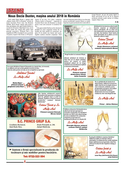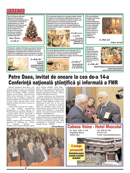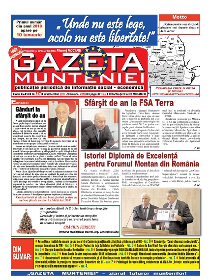 A ieşit de sub tipar nr. 317 al publicaţiei regionale “Gazeta Munteniei”, periodic de informaţie social economică. Din cuprinsul acestei ediţii spicuim: Editorialul intitulat: Gânduri la sfârșit de an – semnat de directorul Florenţ Mocanu, precum şi articole referitoare la: Petre Daea, invitat de onoare la cea de-a 14-a Conferinţă naţională ştiinţifică şi informală a FMR, Dâmbovița: “Control muncă nedeclarată”, compartiment nou la ITM, Piteşti: Protest în faţa Spitalului de Pediatrie, Cadou de Anul Nou! Energia electrică, mai scumpă cu…, Giurgiu: Consiliul Local al Seniorilor, Guvernul pregătește ÎNCHISOAREA DATORNICILOR, inclusiv pentru pensionarii care nu-și plătesc la timp dările, Noua Dacia Duster, mașina anului 2018 în România, Ploieşti: Medalionul comemorativ „Recviem Nichita Stănescu”, Constructorii trebuie să respecte contractele și să finalizeze toate lucrările înainte de recepția proiectelor, Rolul preventiv al sistemului judiciar în protejarea intereselor financiare ale UE, Psihologul Cerasela Libeg, colaborator al APAH-RO: „Relaţia medic-pacient este esenţială în tratamentul hepatitei”.