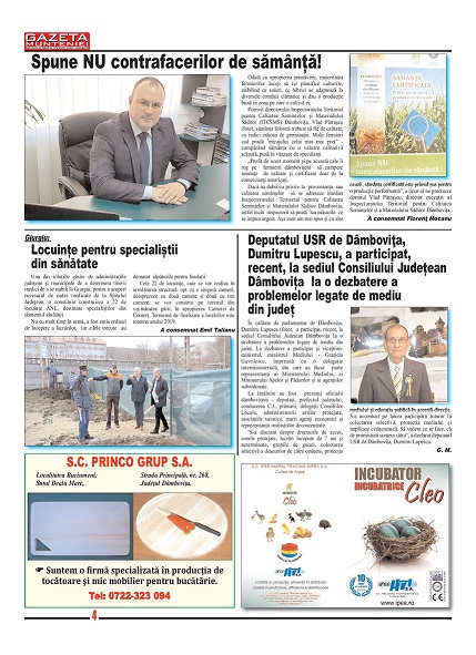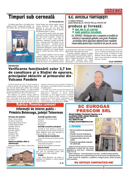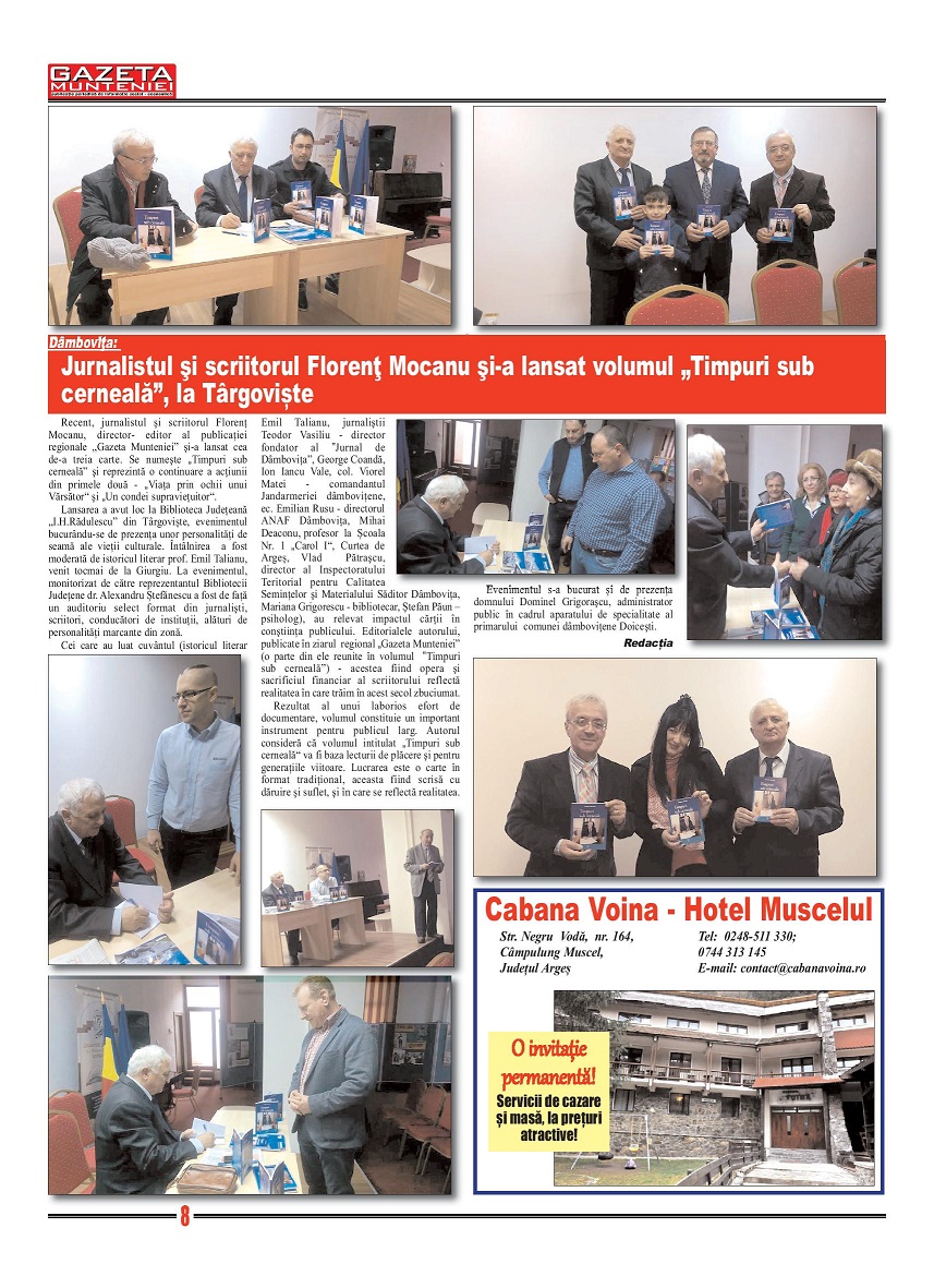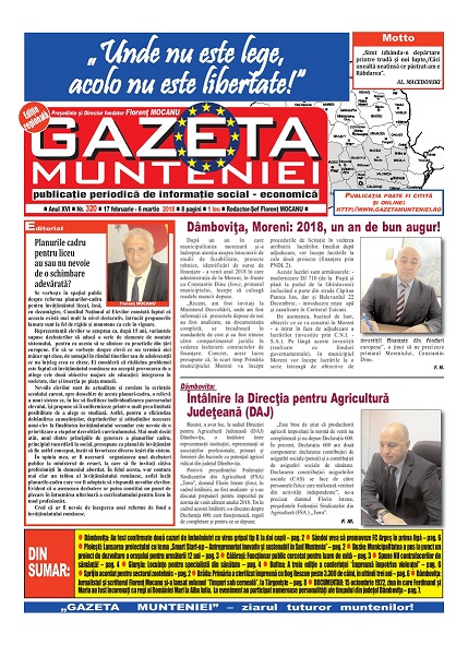 A ieşit de sub tipar nr. 320 al publicaţiei regionale “Gazeta Munteniei”, periodic de informaţie social economică. Din cuprinsul acestei ediţii spicuim: Editorialul intitulat: Planurile cadru pentru liceu au sau nu nevoie de o schimbare adevărată? – semnat de directorul Florenţ Mocanu, precum şi articole referitoare la: Dâmbovița: Au fost confirmate două cazuri de îmbolnăviri cu virus gripal tip B la doi copii, Săndoi vrea să promoveze FC Argeș în prima ligă, Ploieşti: Lansarea proiectului cu tema „Smart Start-up – Antreprenoriat inovativ și sustenabil în Sud Muntenia”, Buzău: Municipalitatea a pus la punct un proiect de dezvoltare a oraşului pentru următorii 12 ani, Călărași: Funcționar public cercetat pentru luare de mită, Spune NU contrafacerilor de sămânță!, Giurgiu: Locuinţe pentru specialiştii din sănătate, Buftea: A treia ediție a conferinței ‟Împreună împotriva violenței”, Sprijin acordat pentru sectorul zootehnic, Brăila: Primăria a sterilizat împreună cu Dog Rescue peste 3.300 de câini, în ultimii trei ani, Dâmboviţa: Jurnalistul şi scriitorul Florenţ Mocanu şi-a lansat volumul ‟Timpuri sub cerneală”, la Târgoviște, DOCUMENTAR: 15 octombrie 1922, ziua în care Ferdinand și Maria au fost încoronați ca regi ai României Mari la Alba Iulia. La eveniment au participat numeroase personalități ale timpului din județul Dâmbovița.