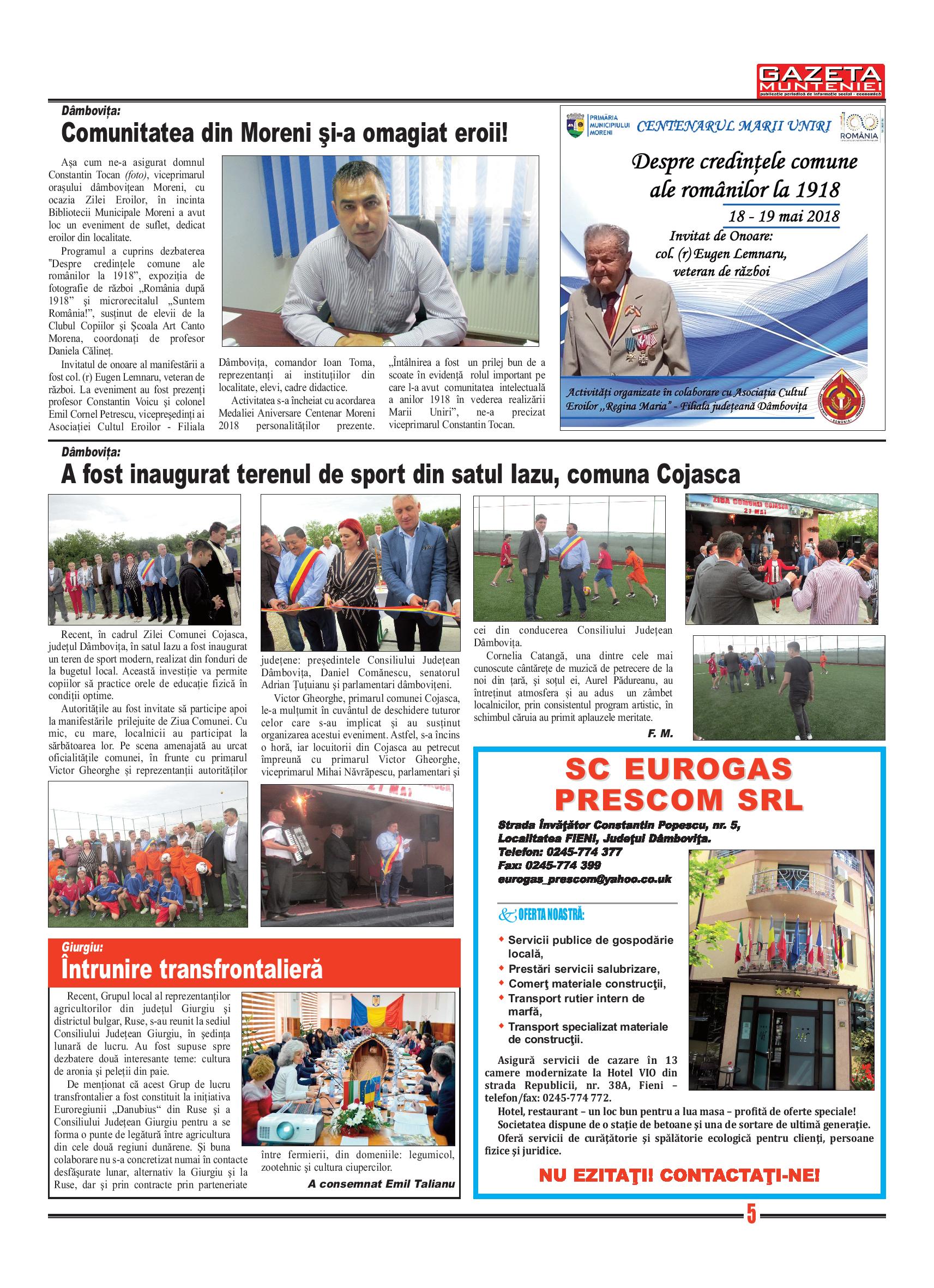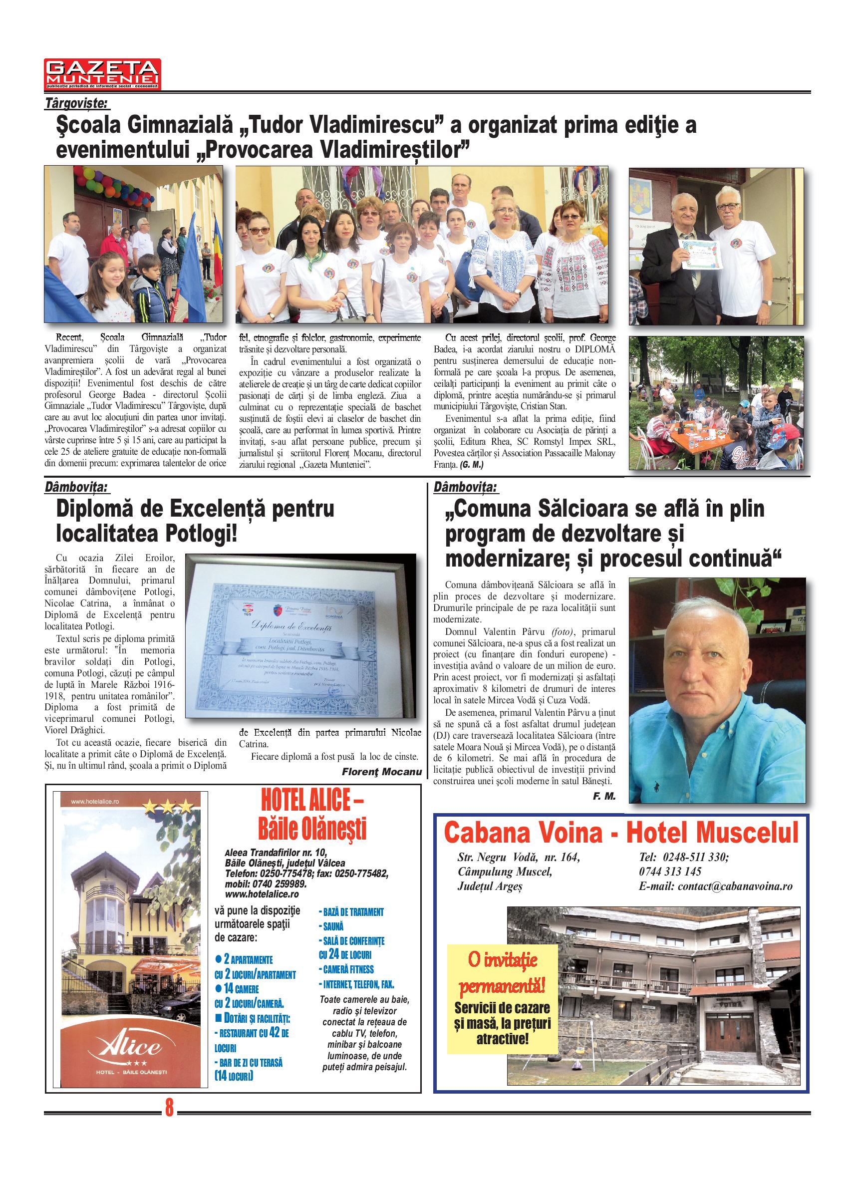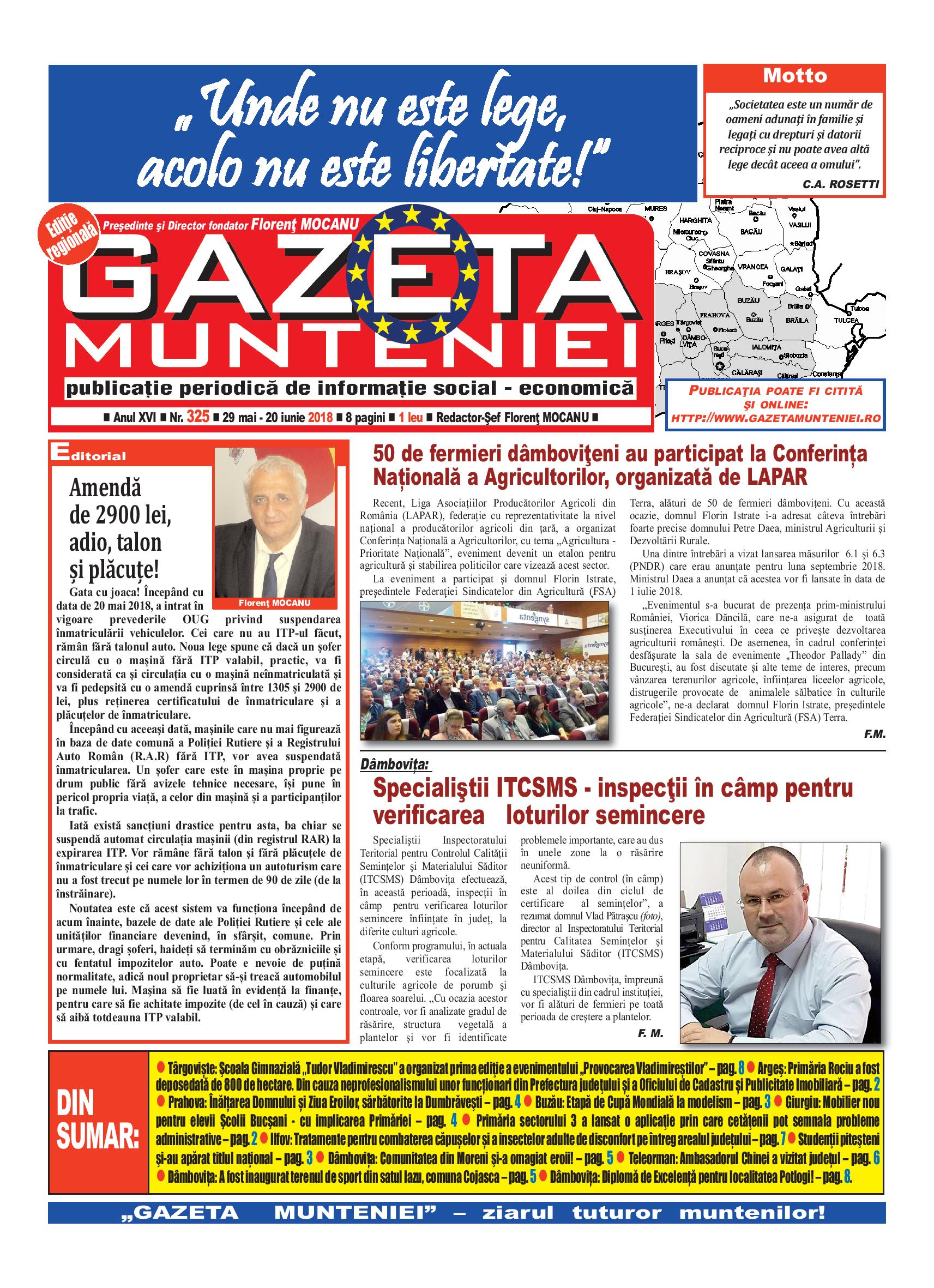 A ieşit de sub tipar nr. 325 al publicaţiei regionale “Gazeta Munteniei”, periodic de informaţie social economică. Din cuprinsul acestei ediţii spicuim: Editorialul intitulat: Amendă de 2900 lei, adio talon și plăcuțe! – semnat de directorul Florenţ Mocanu, precum şi articole referitoare la: Târgoviște: Şcoala Gimnazială ‟Tudor Vladimirescu” a organizat prima ediţie a evenimentului ‟Provocarea Vladimireștilor”, Argeş: Primăria Rociu a fost deposedată de 800 de hectare. Din cauza neprofesionalismului unor funcționari din Prefectura judeţului și a Oficiului de Cadastru și Publicitate Imobiliară, Prahova: Înălțarea Domnului și Ziua Eroilor, sărbătorite la Dumbrăveşti, Buzău: Etapă de Cupă Mondială la modelism, Giurgiu: Mobilier nou pentru elevii Şcolii Bucşani – cu implicarea Primăriei, Primăria sectorului 3 a lansat o aplicaţie prin care cetăţenii pot semnala probleme administrative, Ilfov: Tratamente pentru combaterea căpușelor și a insectelor adulte de disconfort pe întreg arealul județului, Studenţii piteşteni şi-au apărat titlul naţional, Dâmbovița: Comunitatea din Moreni şi-a omagiat eroii!, Teleorman: Ambasadorul Chinei a vizitat judeţul, Dâmbovița: A fost inaugurat terenul de sport din satul Iazu, comuna Cojasca, Dâmbovița: Diplomă de Excelență pentru localitatea Potlogi!.