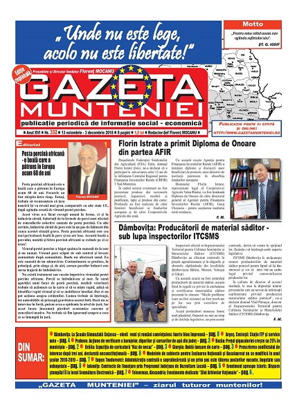 A ieşit de sub tipar nr. 332 al publicaţiei regionale “Gazeta Munteniei”, periodic de informaţie social economică. Din cuprinsul acestei ediţii spicuim: Editorialul intitulat: Pesta porcină africană – o boală care a pătruns în Europa acum 60 de ani – semnat de directorul Florenţ Mocanu, precum şi articole referitoare la: Dâmbovița: La Școala Gimnazială Cojasca – elevii romi şi români conviețuiesc foarte bine împreună, Argeş, Costești: Staţie ITP şi service auto, Prahova: Acțiune de verificare a barajelor, digurilor și cursurilor de apă din județ, Buzău: Preţul gigacaloriei creşte cu 25% în municipiu. Brăila: Expoziția de caricatură “Haz de necaz”, Giurgiu: Dublă lansare de carte, Prescrierea conflictului de interese după trei ani, declarată neconstituţională, Modelele de subiecte pentru Evaluarea Națională și Bacalaureat nu se modifică în anul școlar 2018-2019, Eugen Teodorovici: Administraţia centrală e supraîncărcată şi un prim pas este tăierea posturilor vacante, bugetate sau nebugetate, Ialomița: Contracte de finanţare prin Programul Județean de Dezvoltare Locală, Eveniment aproape istoric: Dispare ștampila! Îi ia locul Semnătura Electronică, Teleorman, Alexandria: Evenimente dedicate “Zilei Arhivelor Naţionale”.