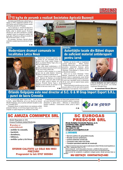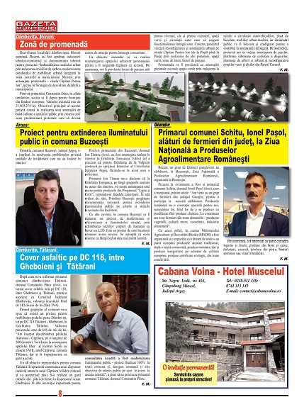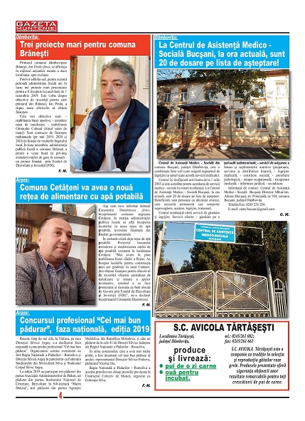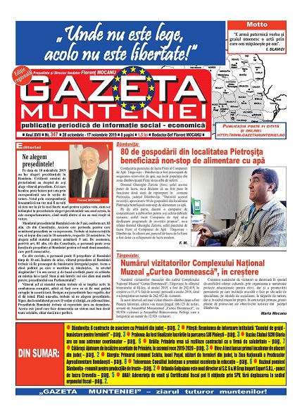 A ieşit de sub tipar nr. 347 al publicaţiei regionale “Gazeta Munteniei”, periodic de informaţie social economică. Din cuprinsul acestei ediţii spicuim: Editorialul intitulat: Ne alegem președintele! – semnat de directorul Florenţ Mocanu, precum şi articole referitoare la: Dâmbovița: 8 contracte de asociere cu Primării din județ, Pitești: Reuniunea de informare intitulată “Gunoiul de grajd – bunăstare pentru fermieri!”, Prahova: Au fost finalizate lucrările la parcarea SJU Ploiești, Buzău: Clubul SCM Gloria are un nou antrenor coordonator, Brăila: Primăria vrea să rezilieze contractul cu o firmă de salubritate, Călărași: Ajutoare de încălzire acordate de Primărie, în sezonul rece 2019-2020, Ilfov: A fost lansat primul incubator de afaceri din judeţ, Giurgiu: Primarul comunei Schitu, Ionel Pașol, alături de fermieri din judeţ, la Ziua Naţională a Produselor Agroalimentare Româneşti, Teleorman: Consiliul Judeţean a premiat excelenţa în educaţie, Bazinul pomicol Dâmboviţa – renumit pentru producţiile de fructe, Orlando Golgojanu este noul director al S.C. G & M Grup Import Export S.R.L. – punct de lucru Crevedia, ANAF: Adeverinţa de venit şi Certificatul fiscal pot fi obţinute prin SPV, fără deplasarea la sediul organului fiscal.