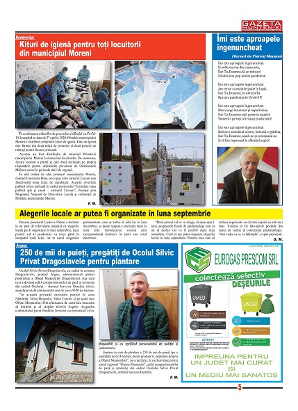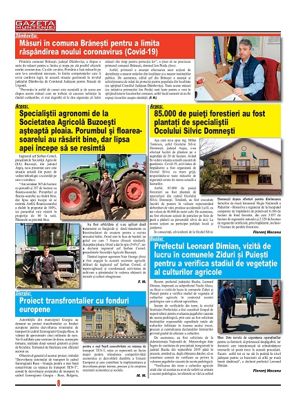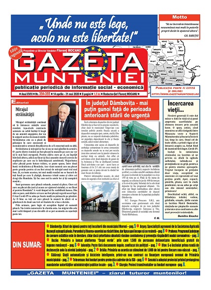 A ieşit de sub tipar nr. 354-355 al publicaţiei regionale “Gazeta Munteniei”, periodic de informaţie social economică. Din cuprinsul acestei ediţii spicuim: Editorialul intitulat: Mirajul străinătăţii – semnat de directorul Florenţ Mocanu, precum şi articole referitoare la: Dâmbovița: Kituri de igienă pentru toți locuitorii din municipiul Moreni, Argeș: Specialiştii agronomi de la Societatea Agricolă Buzoeşti aşteaptă ploaia. Porumbul şi floarea-soarelui au răsărit bine, dar lipsa apei începe să se resimtă, Prahova: Programul județean de covoare asfaltice este în derulare, chiar dacă prioritatea absolută rămâne combaterea și prevenția răspândirii noului coronavirus, Buzău: Primăria a lansat platforma “Coşul verde”, prin care 1.500 de persoane defavorizate beneficiază gratuit de legume româneşti, Ialomița: Peşte fără documente legale, confiscat de poliţişti, Ilfov: S-a încheiat prima rundă de dezinsecție avio la nivelul județului, Brăila: Primăria va acorda un stimulent de 1.000 de lei pentru fiecare nou-născut, Călărași: Stații automatizate și biciclete inteligente, printr-un nou contract cu finanțare europeană semnat de Primăria municipiului, Teleorman: Noi fonduri pentru protecția cadrelor de la ISU, Senatul a adoptat proiectul privind prelungirea mandatelor autorităţilor administraţiei publice locale, Giurgiu: Proiect transfrontalier cu fonduri europene.
