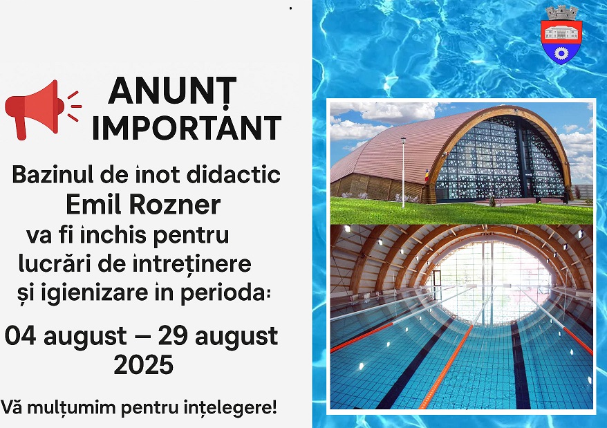 Primaria Orasului Titu, anunta ca – Bazinul de înot didactic Emil Rozner va fi închis pentru lucrări de întreținere și igienizare în perioada: 04 august – 29 august 2025.