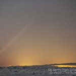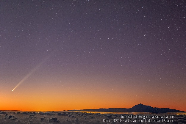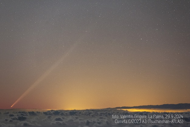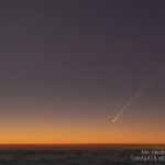 În imgini se vede coada lungă a cometei pe cer, în crepuscul.