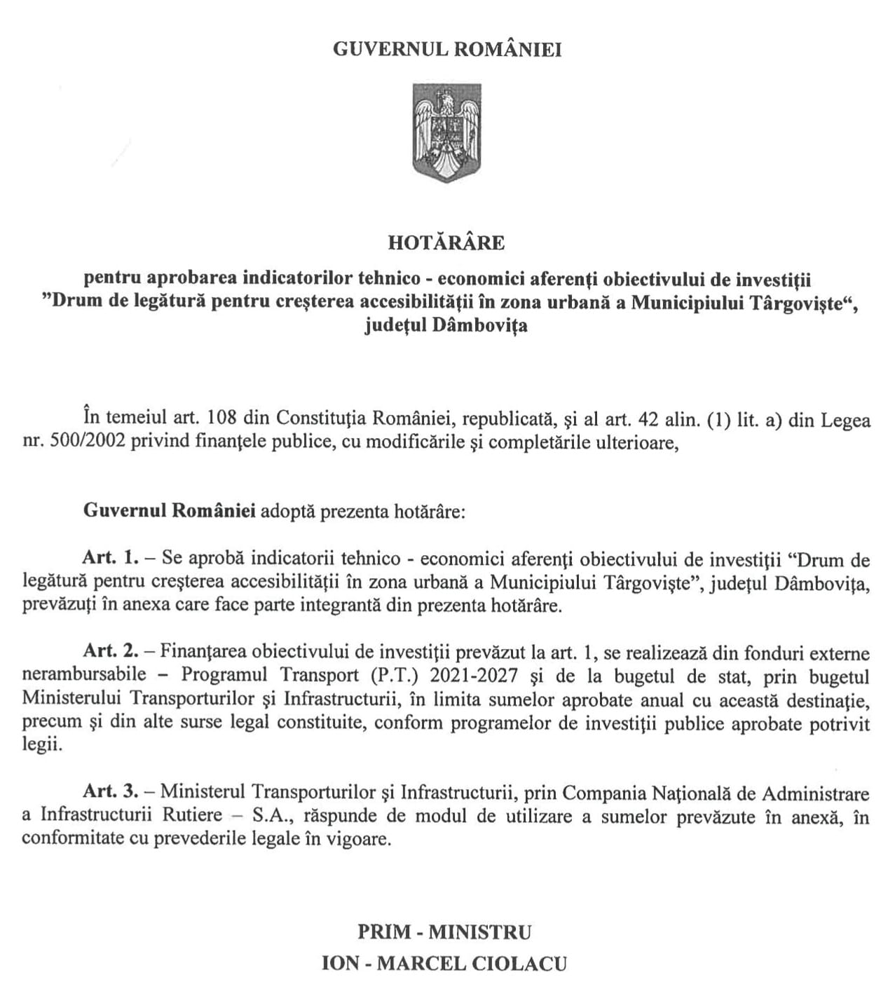 În această dimineață, prin hotărâre de Guvern, au fost aprobați indicatorii tehnico-economici pentru Inelul 2 de Centură al Municipiului Târgoviște.