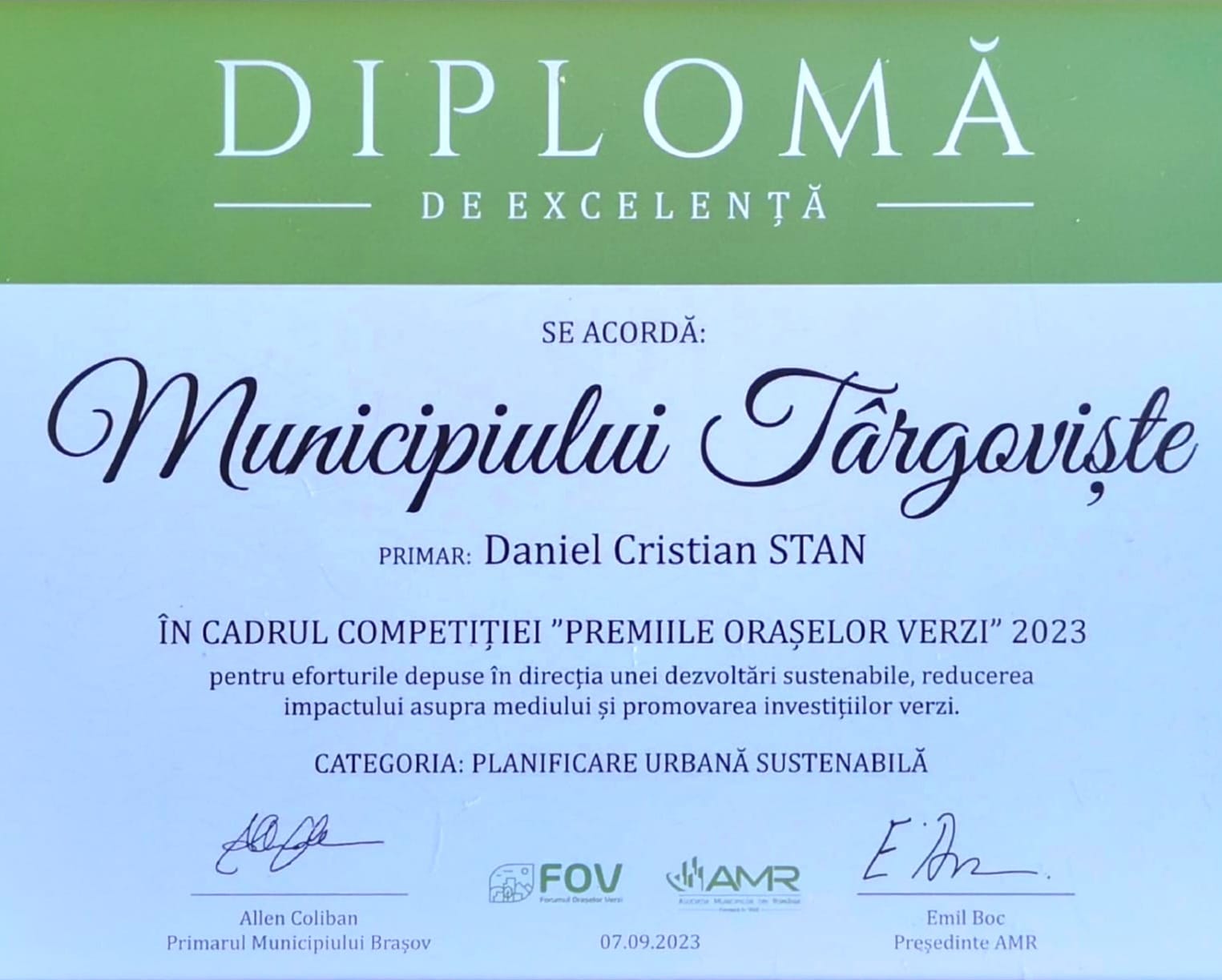 Municipiul Târgoviște primește unul dintre cele 3 trofee acordate și diploma de excelență în cadrul competiției „Premiile Orașelor Verzi 2023″ la categoria “PLANIFICARE URBANĂ SUSTENABILĂ”!