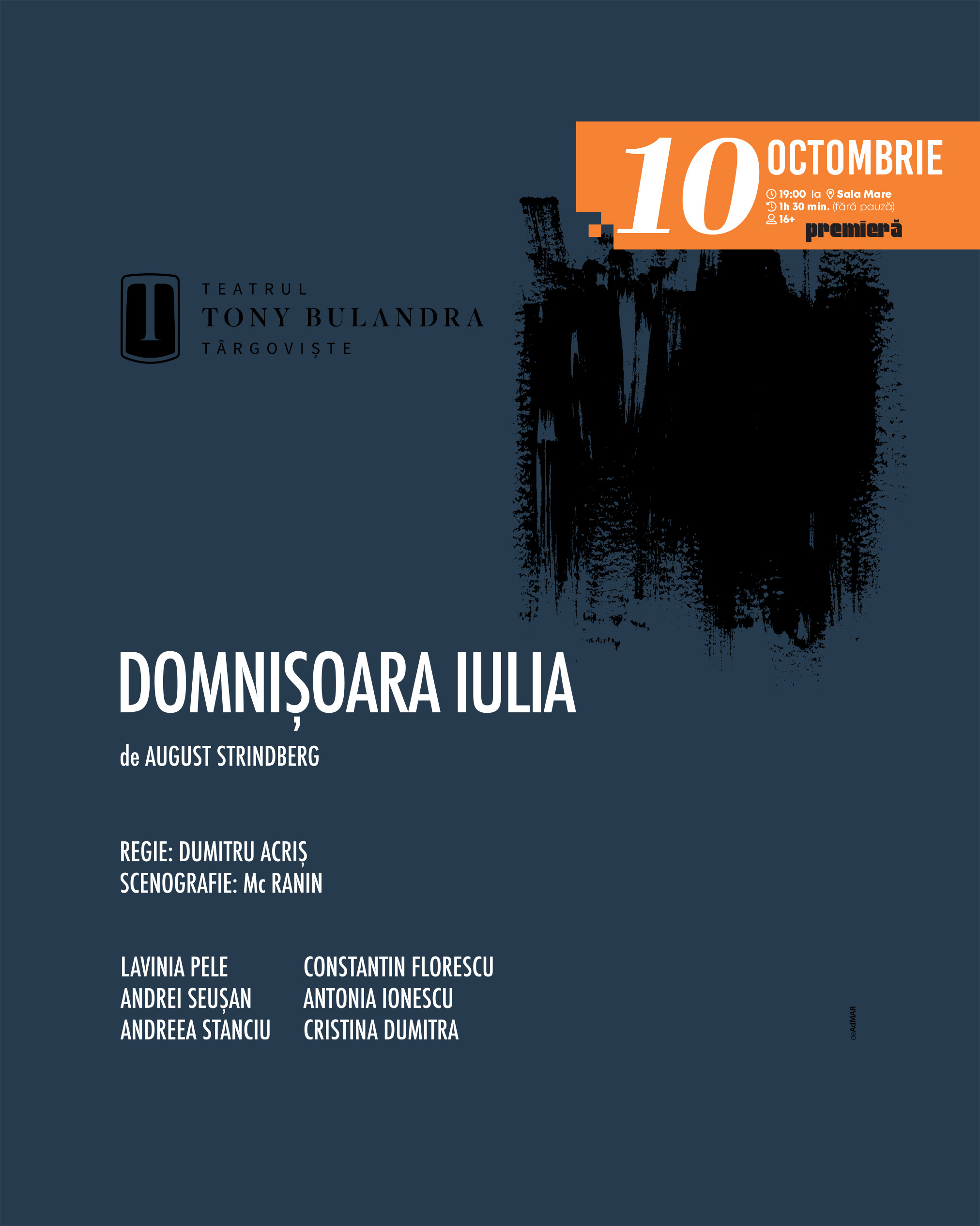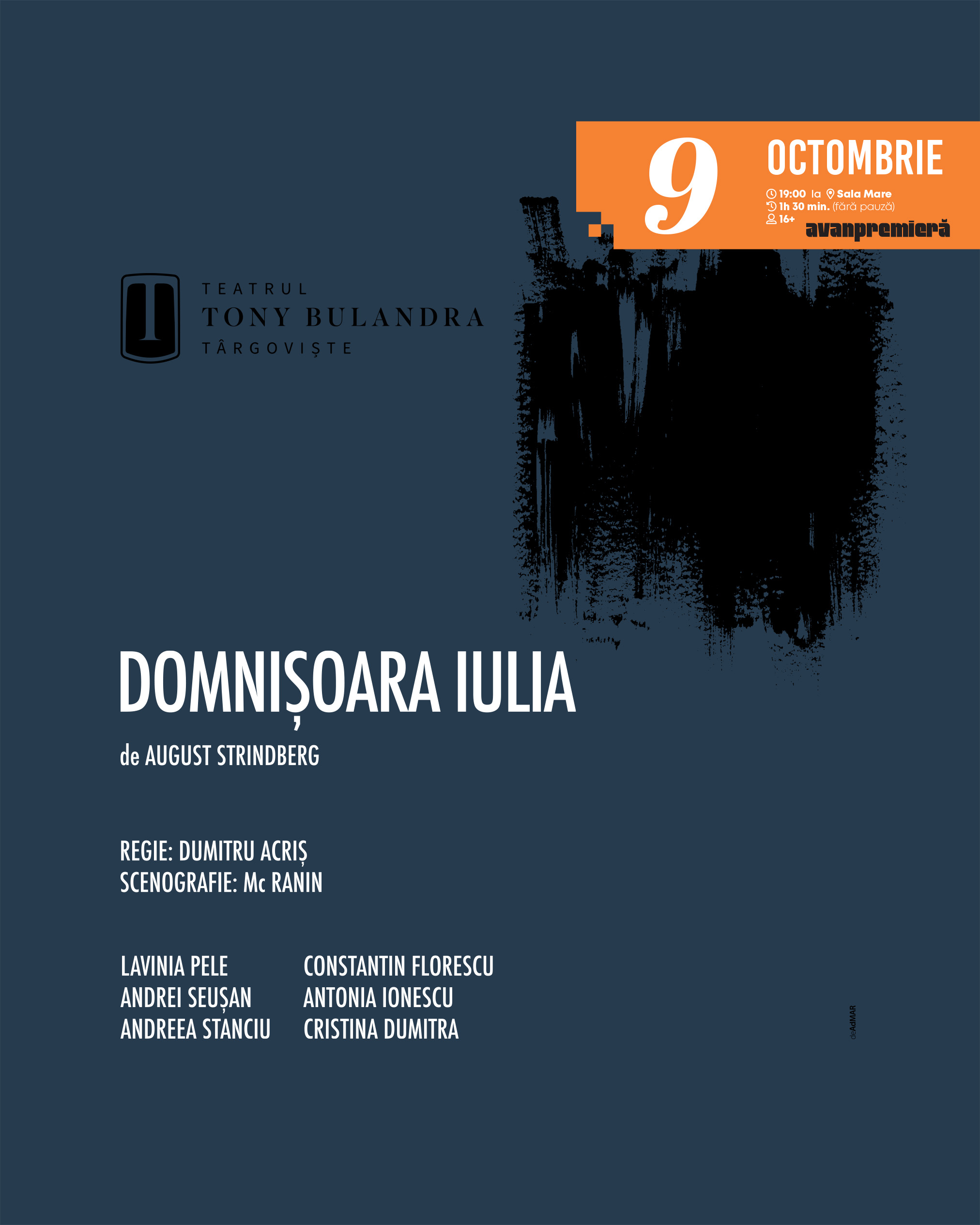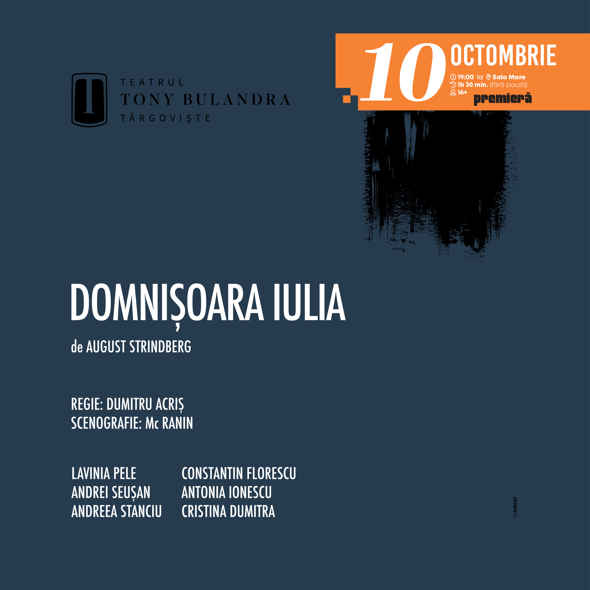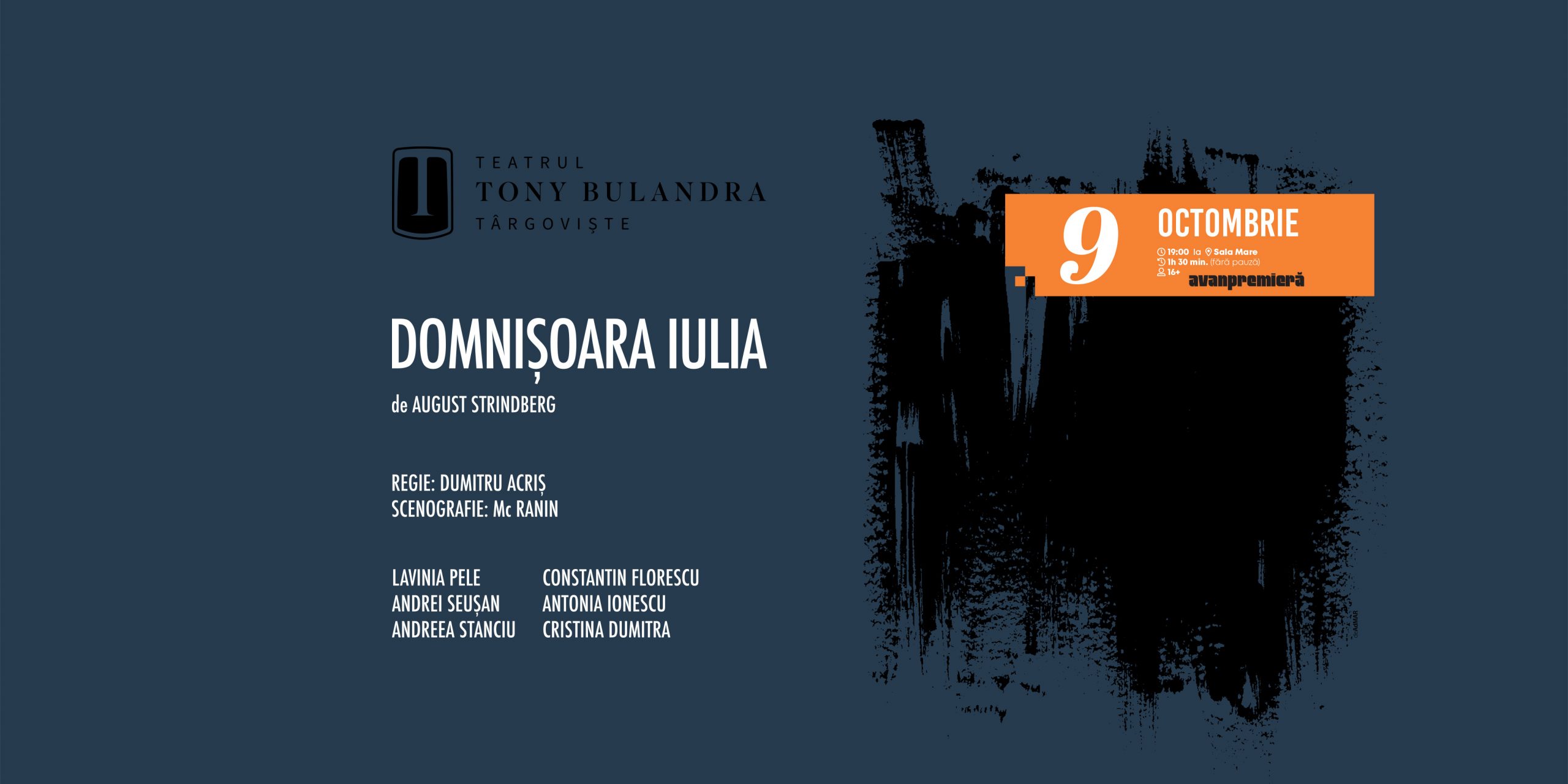 Joi, 9 octombrie, de la ora 19:00, publicul este invitat la avanpremiera spectacolului „Domnișoara Iulia”, iar vineri, 10 octombrie, la premieră.
