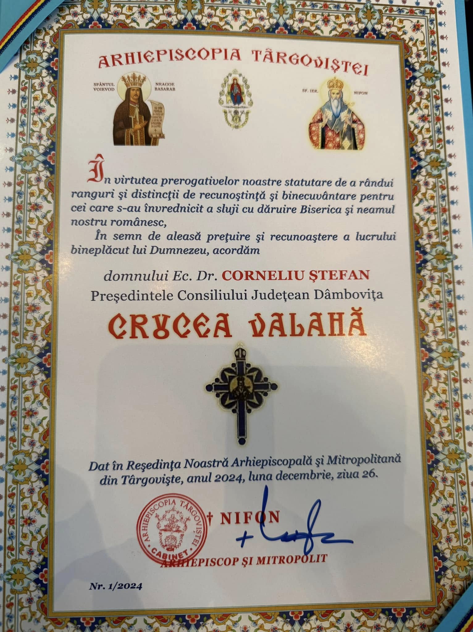 Înaltpreasfințitul Părinte Arhiepiscop și Mitropolit Nifon – un sfert de veac la Târgoviște, în slujba Bisericii și a neamului românesc! „Astăzi – 25 de ani de la întronizarea Înaltpreasfințitului Părinte Mitropolit Nifon Arhiepiscop al Târgoviştei! Un sfert de veac în care ați fost un model de credință, înțelepciune și grijă, un adevărat ambasador al valorilor creștine și al județului nostru! Tot astăzi, Înaltpreasfinţia Sa mi-a oferit “Crucea Valahă”, cea mai înaltă distincţie pe care o oferă Arhiepiscopia Târgoviştei. Îi adresez mulţumiri alese, fiind o onoare pentru mine să primesc această distincţie în semn de prețuire şi recunoştinţă. Dâmbovița este mai bogată atât timp cât sunteți alături de noi! Și pentru asta, dar și pentru tot ceea ce faceți pentru dâmbovițeni, vă mulțumim! Să ne trăiți întru mulți și fericiți ani, Înaltpreasfinția Voastră!”- a ţinut să transmită președintele Consiliului Județean Dâmbovița, Corneliu Ștefan.