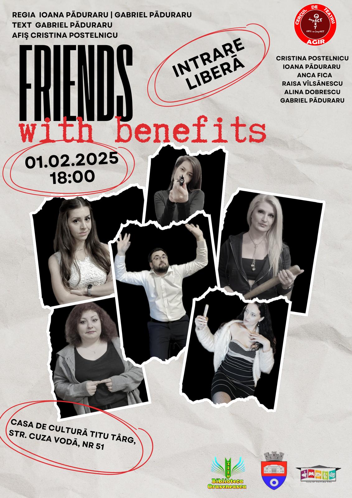 Daca vrei sa razi incercand sa tratezi probleme foarte seriose de cuplu si daca vrei sa te relaxezi urmarind tensiunea unor relatii neobisnuite in situatii limita ;totul pigmentat de eterna neconcordanta intre dorintele masculine si nevoile feminine atunci hai sa ne imprietenim cu beneficii intr-un spectacol antrenant si insotit de buna dispozitie!