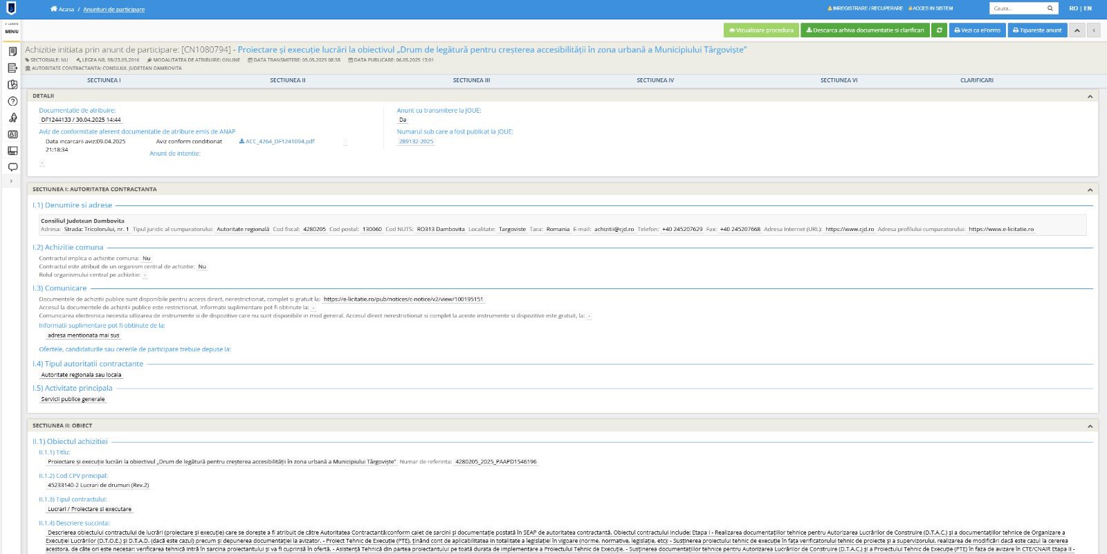 „ASTĂZI, FACEM UN PAS URIAȘ SPRE VIITOR: au fost scoase la licitație proiectarea și execuția unuia dintre cele mai importante proiecte de infrastructură rutieră ale județului Dâmbovița – “Drumul de legătură pentru creșterea accesibilității în zona urbană a Municipiului Târgoviște”. Gândit în regim de drum expres, noul inel de centură va avea o lungime de 16,31 km și va ocoli Municipiul Târgoviște, dar și comunele Aninoasa, Doicești, Șotânga, Dragomirești, Ulmi și Lucieni. Se va circula pe patru benzi, câte două pe sens, fiecare bandă având o lățime de 3,5 metri, ceea ce va permite un flux rapid și sigur al traficului. De asemenea, pe traseu vor fi construite 5 poduri, 15 pasaje, 2 viaducte și 5 tuneluri dedicate protejării faunei. Valoarea contractului de proiectare și execuție este estimată la aproximativ 723.000.000 lei, iar cea a întregului proiect este de peste 980.000.000 de lei. Noul drum nu înseamnă doar infrastructură rutieră, ci creează o legătură între comunități, deblochează traficul și deschide ușa către investiții și dezvoltare economică durabilă. Infrastructura de mâine începe de astăzi!”- a ținut să precizeze președintele CJ Dâmbovița, Corneliu Ștefan.