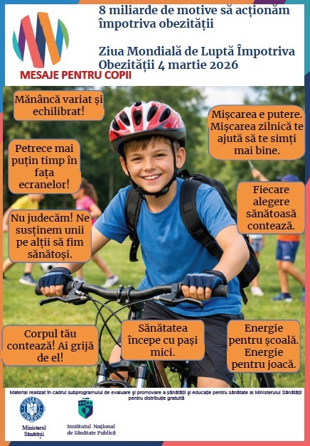 „8 miliarde de motive să acționăm împotriva obezității” Ziua Mondială de Luptă Împotriva Obezității este o inițiativă a Federației Mondiale a Obezității, lansată în anul 2015, cu scopul de a promova soluții practice care să sprijine oamenii să obțină și să mențină o greutate sănătoasă, să beneficieze de tratament adecvat și astfel să contribuie la reducerea numărului de cazuri de obezitate. Obezitatea: o provocare globală care ne privește pe toți Tema ediției din anul 2026 – „8 miliarde de motive să acționăm împotriva obezității” – reflectă atât numărul persoanelor de la nivel mondial, cât și responsabilitatea comună de a aborda această problemă de sănătate publică.Anul acesta, mesajele transmise cu această ocazie se adresează tuturor persoanelor afectate direct sau indirect de supraponderalitate și obezitate –fiecăruia dintre cei 8 miliarde de oameni – cu un accent deosebit pe cel mai vulnerabil grup: copiii.Estimările internaționale arată că, până în 2035, 4 miliarde de oameni, adică jumătate din populația globului, vor fi afectați de supraponderalitate sau obezitate, dacă nu se iau măsuri pentru a preveni și controla acest fenomen. Obezitatea afectează întreaga societate, contribuind semnificativ la apariția bolilor netransmisibile și reflectând disfuncționalități ale sistemelor sociale, economice și alimentare. Creșterea rapidă a prevalenței obezității infantile în țările cu venituri mici și medii evidențiază, totodată, adâncirea inegalităților în domeniul sănătății. Măsurile orientate spre prevenirea și tratarea obezității aduc avantaje pentru fiecare dintre noi și contribuie la îmbunătățirea sănătății publice. Obezitatea este boală cronică, la apariția căreia contribuie interacțiunile complexe dintre factorii comportamentali, sociali, genetici, biologici și de mediu. Obezitatea nu înseamnă o lipsă de voință a persoanelor afectate. Schimbările în alimentație, accesul facil la alimente ultra-procesate, stilul de viață și contextul economic au generat condiții care favorizează apariția obezității, contribuind astfel la creșterea accelerată a numărului de persoane afectate. Persoanele care trăiesc cu obezitate prezintă un risc crescut de a dezvolta alte boli cronice, precum diabetul, bolile cardiovasculare și anumite forme de cancer.Excesul ponderal la copii afectează sănătatea fizică și mentală, performanțele școlare și calitatea vieții, crescând totodată riscul de obezitate și de boli netransmisibile la vârsta adultă.